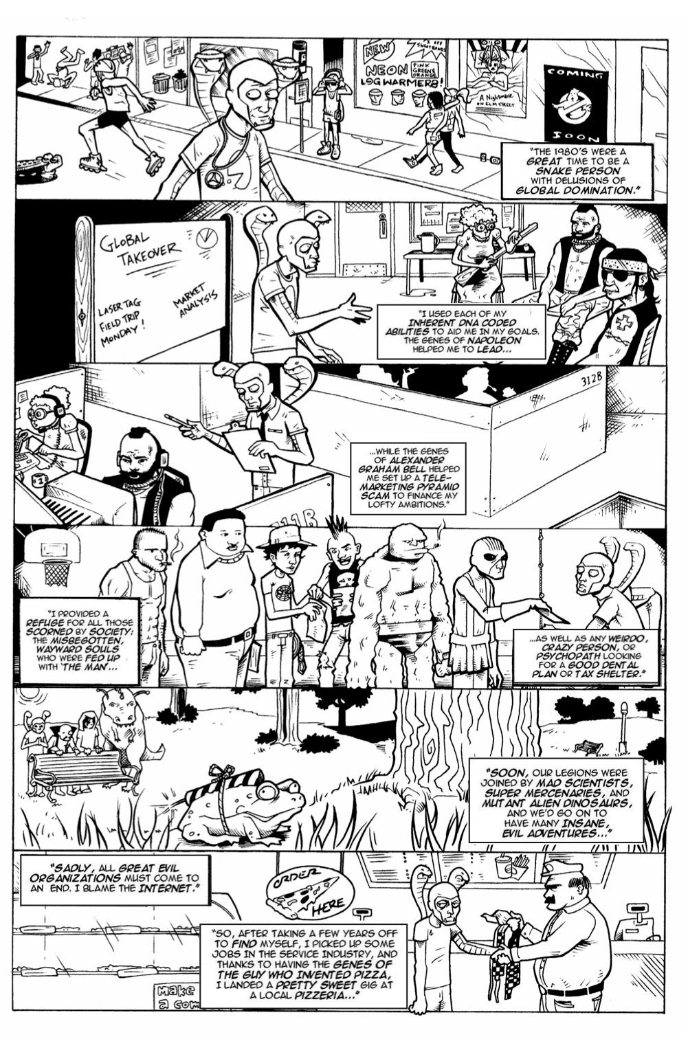 Channeling the ludicrously fun concepts of 1980s action figure biographies, the series focuses on Snakor's quest to find himself in a new world of greasy cheese, broken napkin dispensers and stoned college students. Dealing with newfound family members, former-evil associates and the general pizza-eating public are just the tip of the crust for Snakor as he climbs from washed-up globe-conqueror to pizza-shop emperor.